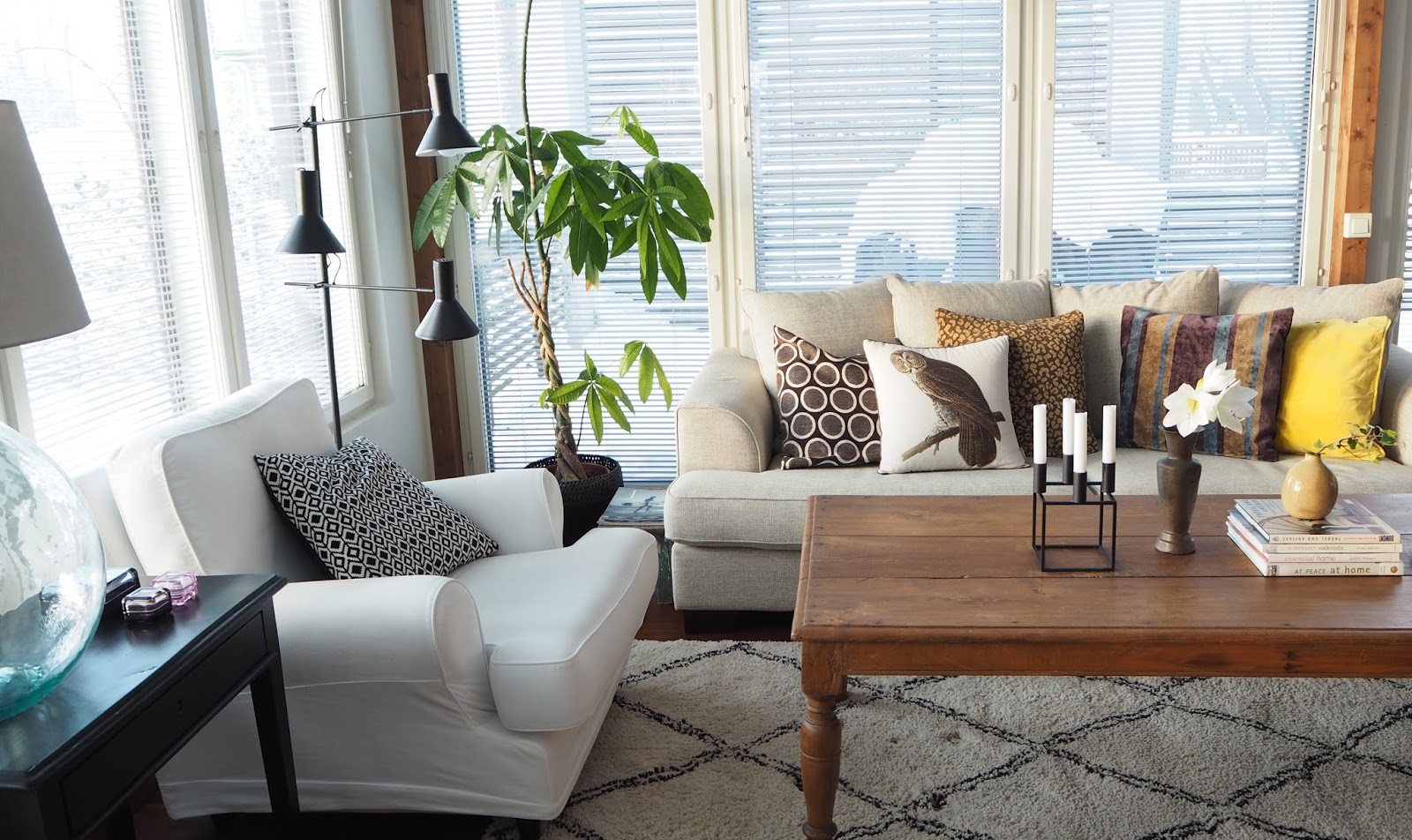 Tämän näköiseen olohuoneeseen tupsahdin eilen; kyllä tottavie näyttää talviselta. Samettiset sohvatyynyt olen ommellut viime syksynä. Löysin kankaat Eurokankaan pala-nurkasta, se onkin oikeastaan ainoita paikkoja, missä on kiinnostavia kansainvälisiä sisustuskangaseriä ja mistä saa kankaat heti mukaansa. Mutta nyt tyynyt näyttävät kyllä ihan liian talvisilta, sävyt murretuilta ja kankaat paksuilta. Jotain tarttis tehdä nyt heti!