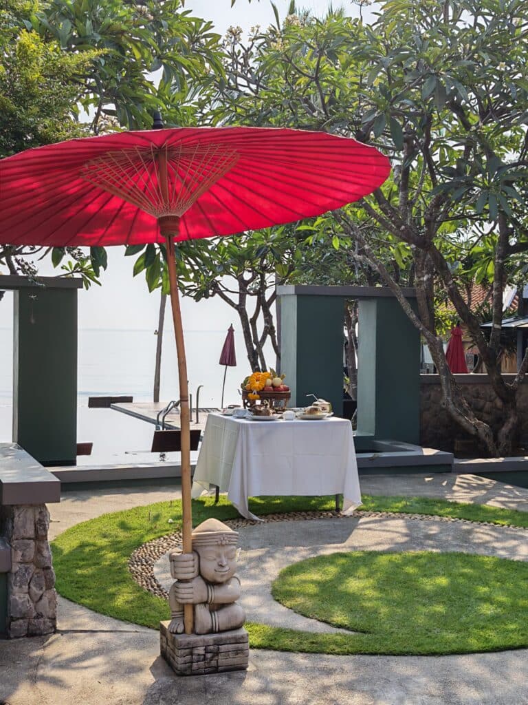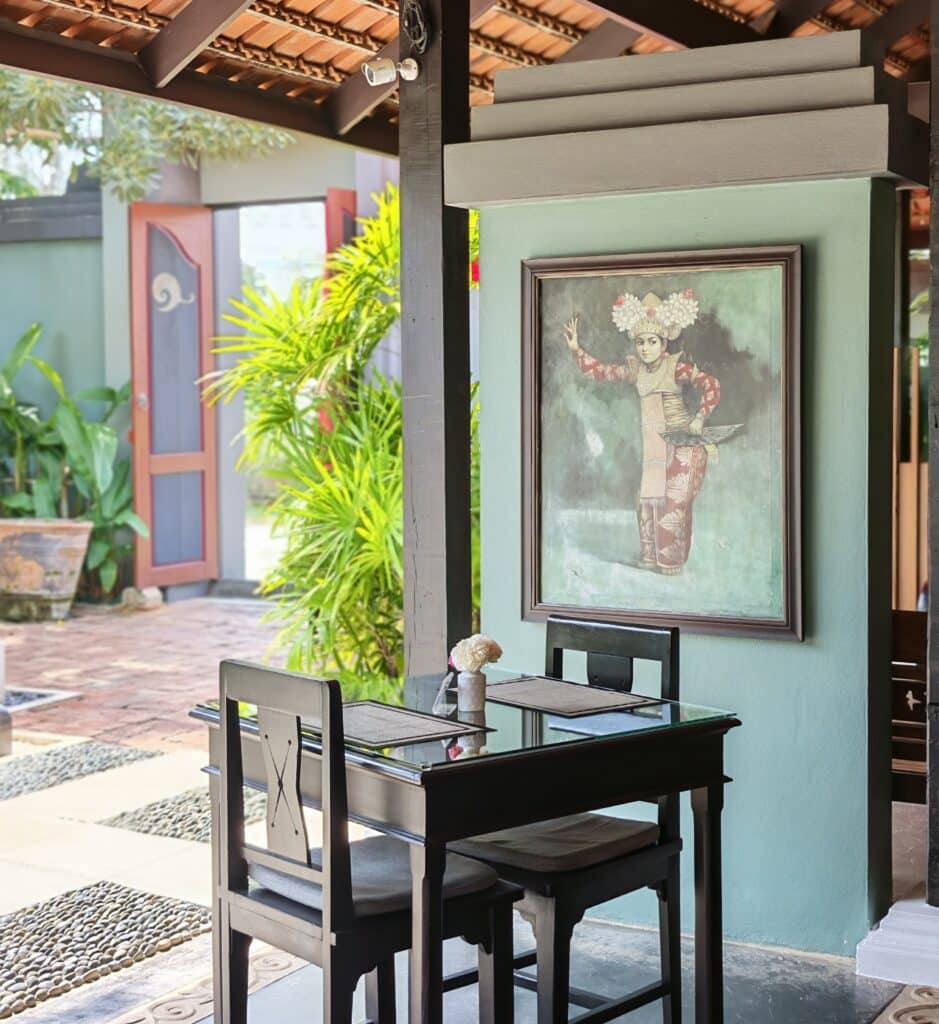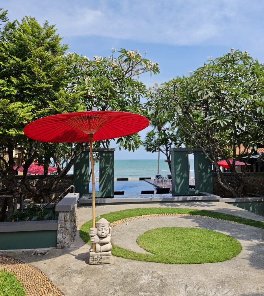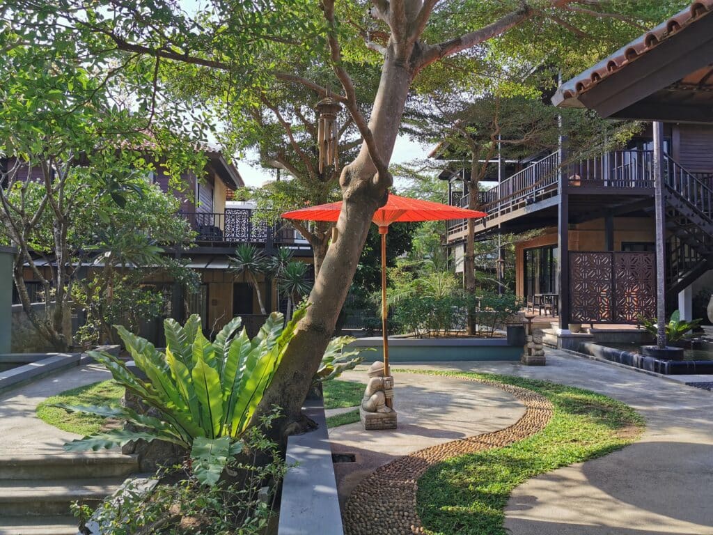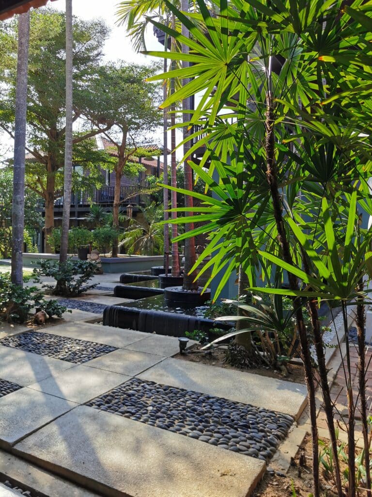 Idyllisen hotellin piha-aluetta ei ole pilattu tehokkuudella – siellä on riittävästi vehreyttä ja kauniita yksityiskohtia. Muutamat matalat rakennukset sijaitsevat hillitysti altaan molemmin puolin eikä niitä juurikaan huomaa rannan suunnalta. Hotellissa on vain 14 huonetta, joten senkin puolesta rauha on taattu. Pikku puutarha on rehevä, täynnä erilaisia puita ja pensaita, jotka antavat sopivasti varjoa. Ne ovat kasvaneet vuosien mittaan kauniiksi vehreäksi keitaaksi. Isot värikkäät perhoset lentelevät kukkivien frangipanipuiden ympärillä. Meditatiivinen musiikki soi hiljaa taustalla. Eikä rannalla ole aurinkotuolirivistöjä!