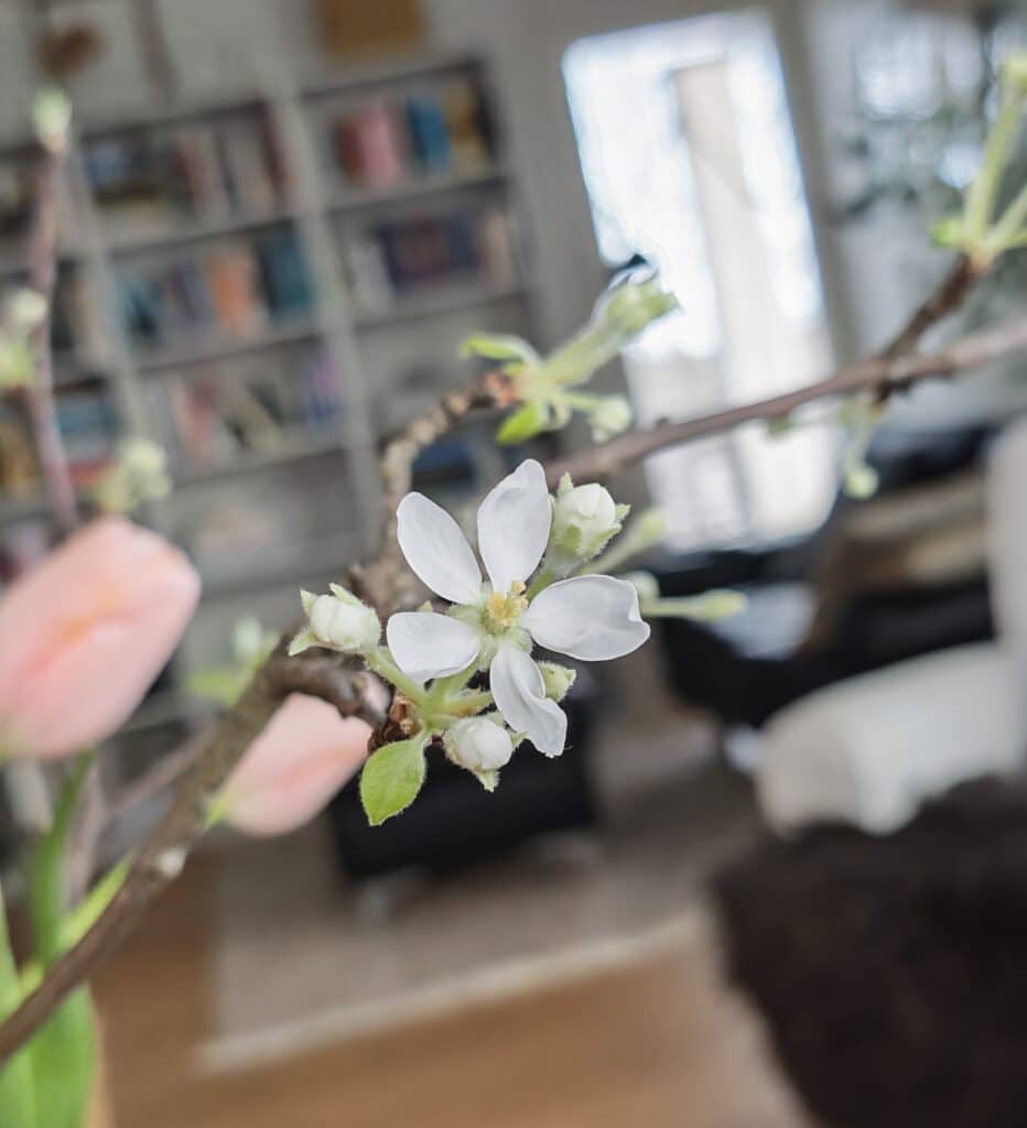 Otin sisälle muutaman omenapuun oksan, kun mieheni leikkeli ja siisti puuta. Kauniit kukat kehittyivätkin reilun viikon sisälläolon aikana.