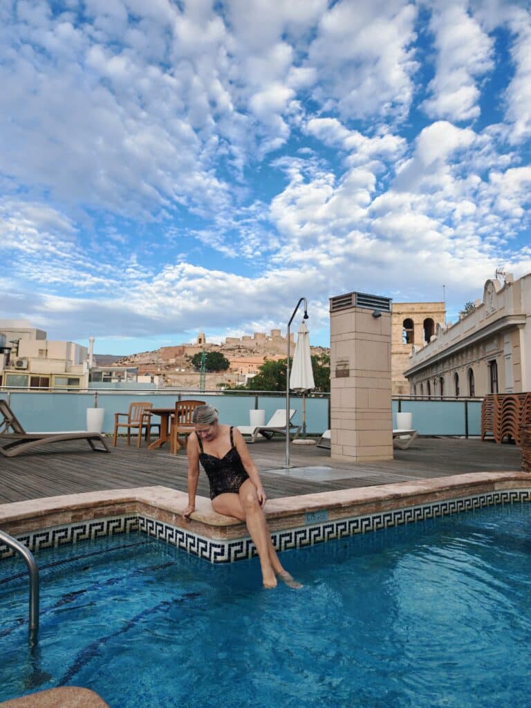 Hotellimme oli ydinkeskustassa, vanhassa kaupungissa ja sijainti oli erinomainen. Halusimme että siellä on uima-allas katolla ja sieltä näkymät, joten päädyimme Hotel Eze Almeria Centroon. Katolta siinsi hienosti näkymät Alcazapa – kukkalalle.
