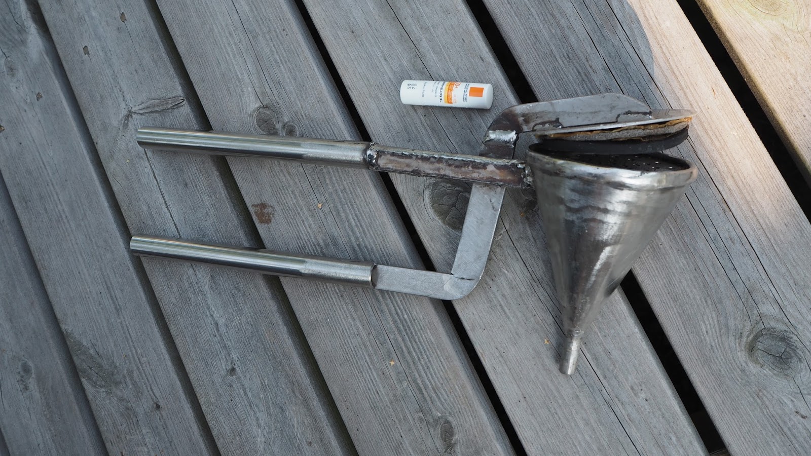 PS No sehän on tyrnipuserrin tietysti! Oksa laitetaan suppilon ja puristimen väliin, ja mehu valuu suoraan laitteeseen kiinnitettyyn pulloon.