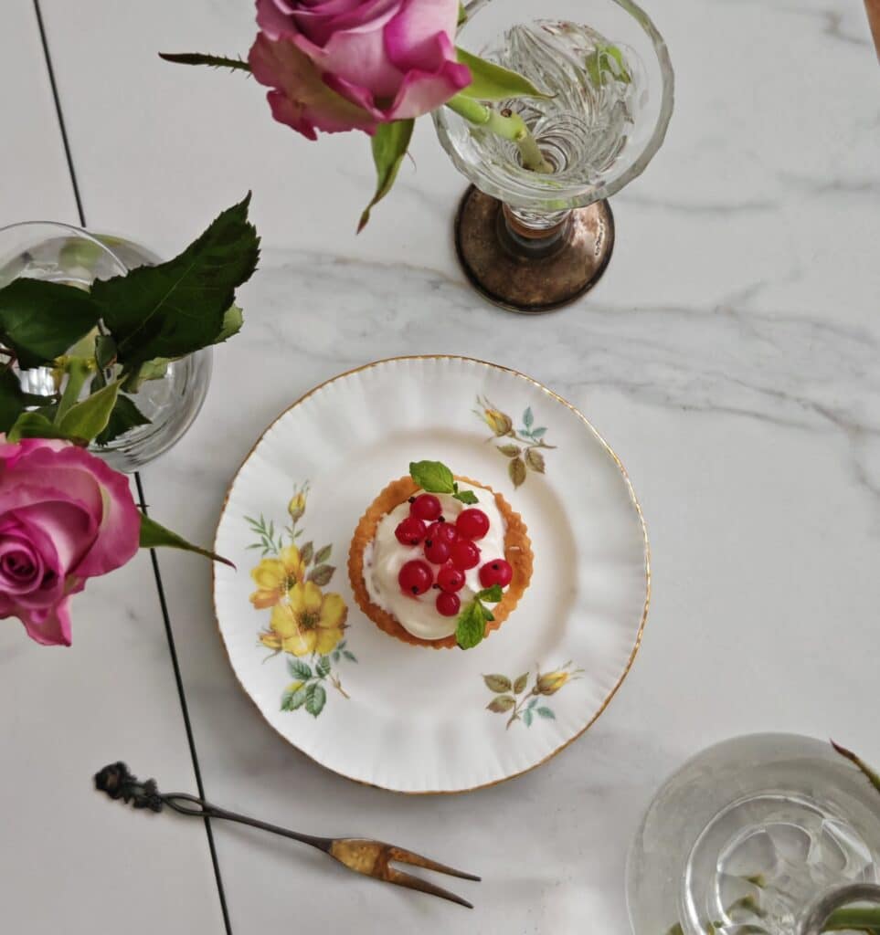 Sekoita mascarponejuuston joukkoon sokerit ja jogurttia sen verran, että saat täytteestä koostumukseltaan sopivan pehmeän. Jaa täyte taikinakuoriin. Ripottele päälle herukat. Koristele halutessasi vielä mintunlehdillä.
