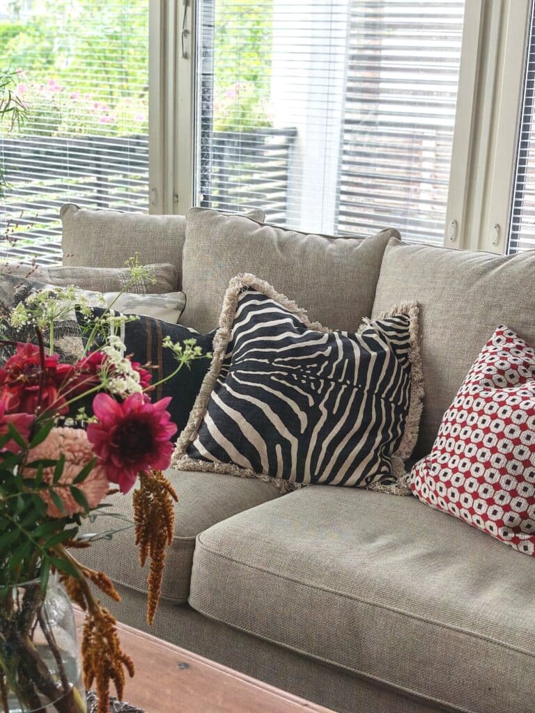 Nämä kuvat on olkkarista, joka odottaa vuoroaan vielä. Koska se näkyy keittiöön ja on koko ajan silmissä, entrasin hieman sen sisustusta. Laitoin uuden seeprakuvioisen tyynynpäällisen paikoilleen ja ystäviltä viikolla saadun syksyisen kimpun pöydälle. Pienillä jutuilla tulikin just se, mitä olen tänne kaivannut. Enkä olisi arvannut, että se kaivattu värikin on tumma vadelma. Se ja viininpunaisen eri sävyt sopiikin näihin meidän väreihin kivasti.